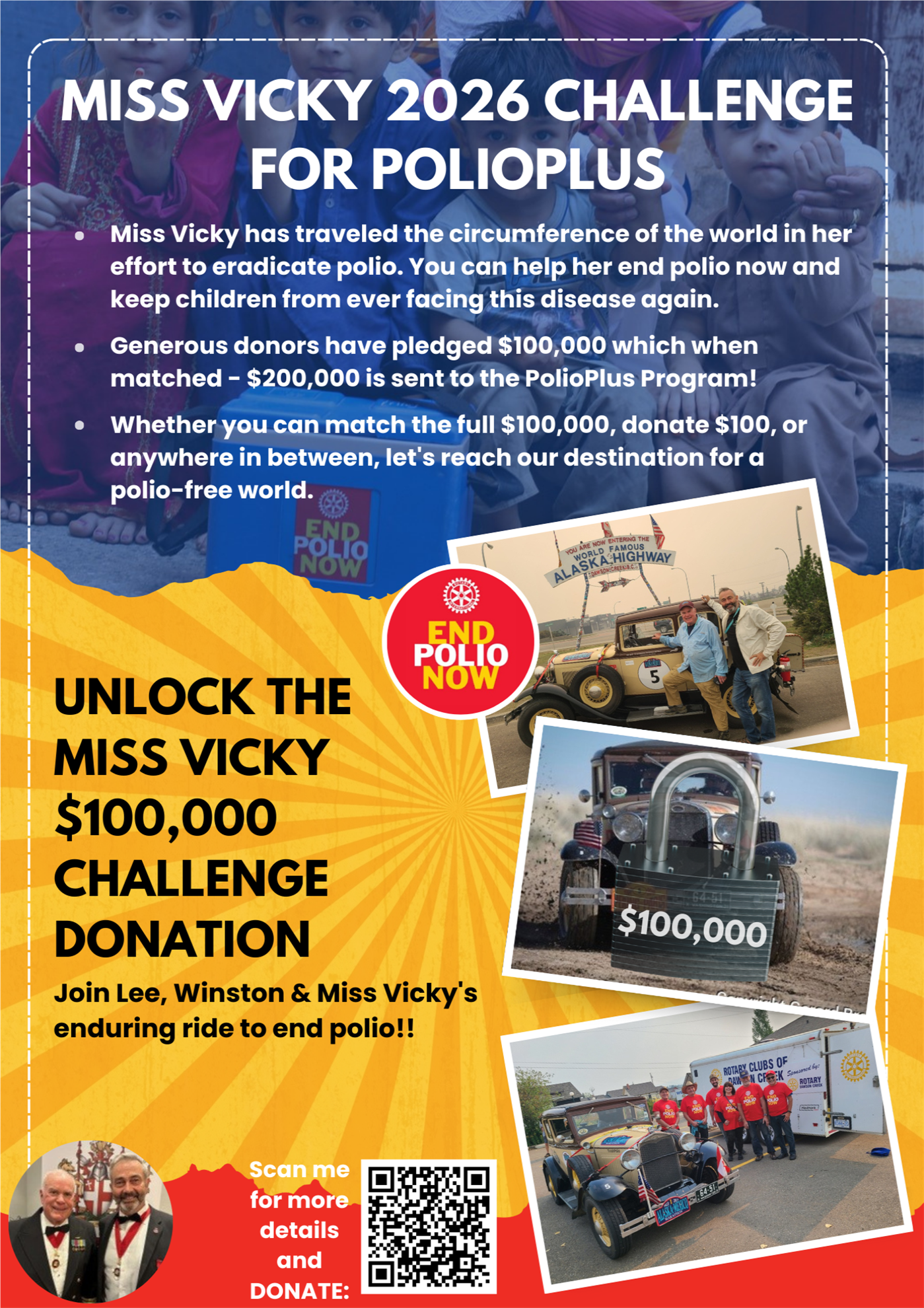 Winston shared highlights from the recent Miss Vicky Challenge trip to northern Alberta speaking at 9 clubs with Dr Lee Harman raising over $50,000 toward the global effort to eradicate polio!